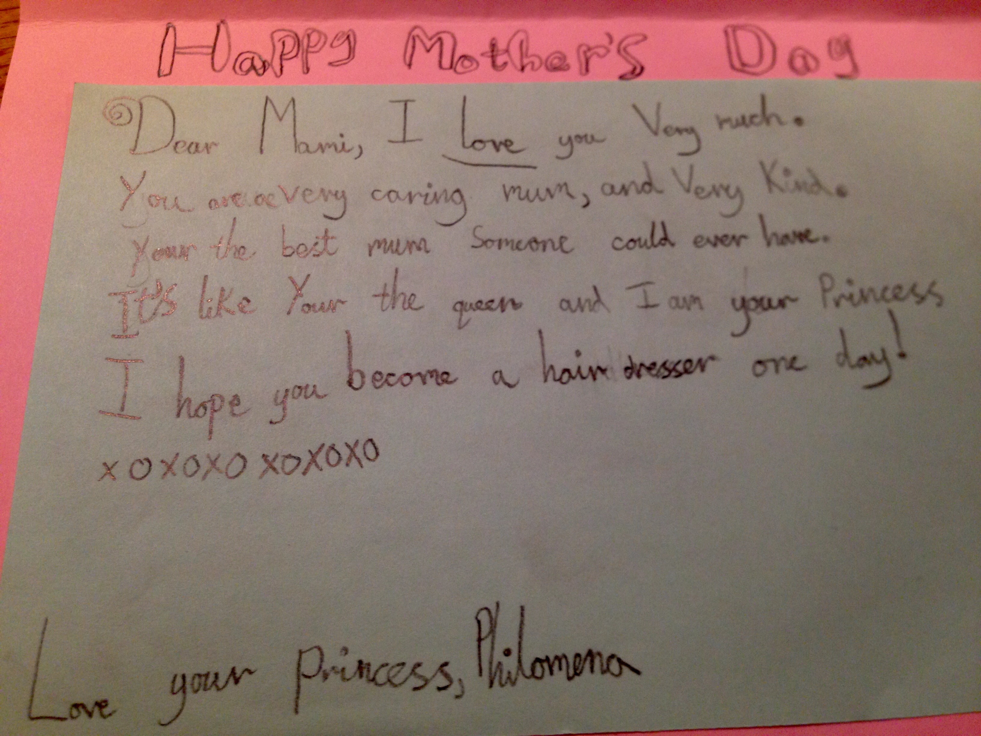 my dearest Philomena–thank you for this beautiful card and for spoiling me yesterday. (and today and tomorrow). i love you so much. this song i dedicate to you, it’s how i feel about you all the time. And yes, maybe one day I will become a hairdresser.